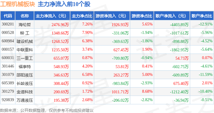 从资金流向上来看,当日工程机械板块主力资金净流出4.55亿元,游资资金净流入2.29亿元,散户资金净流入2.26亿元。工程机械板块个股资金流向见下表: