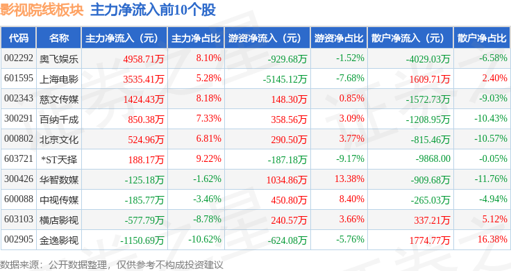 从资金流向上来看,当日影视院线板块主力资金净流出4.77亿元,游资资金净流入2395.33万元,散户资金净流入4.53亿元。影视院线板块个股资金流向见下表: