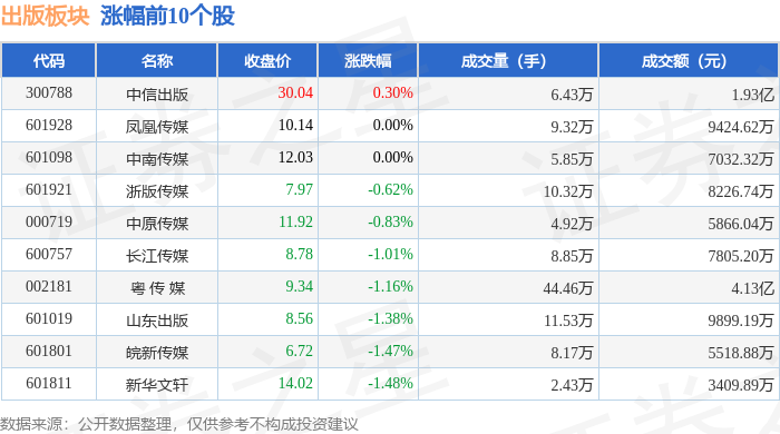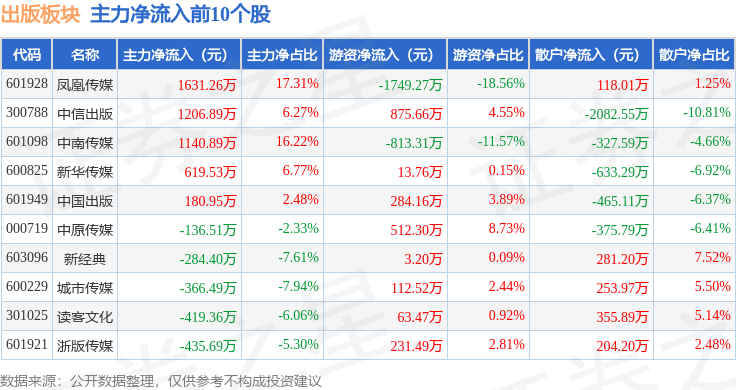 从资金流向上来看,当日出版板块主力资金净流出4.46亿元,游资资金净流入9685.77万元,散户资金净流入3.49亿元。出版板块个股资金流向见下表: