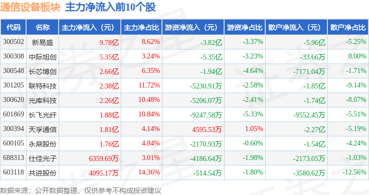 从资金流向上来看,当日通信设备板块主力资金净流入14.37亿元,游资资金净流出5.65亿元,散户资金净流出8.72亿元。通信设备板块个股资金流向见下表: