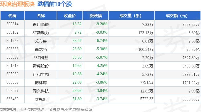 证券之星消息,11月19日环境治理板块较上一交易日下跌0.92%,百川畅银领跌。当日上证指数报收于3946.74,上涨0.18%。深证成指报收于13080.09,下跌0.0%。环境治理板块个股涨跌见下表: