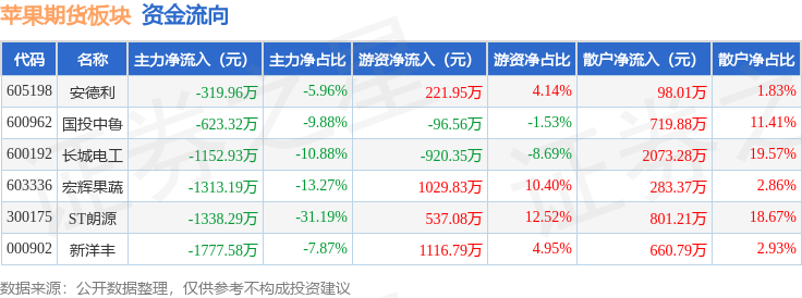 从资金流向上来看,当日苹果期货板块主力资金净流出6525.28万元,游资资金净流入1888.74万元,散户资金净流入4636.53万元。苹果期货板块个股资金流向见下表: