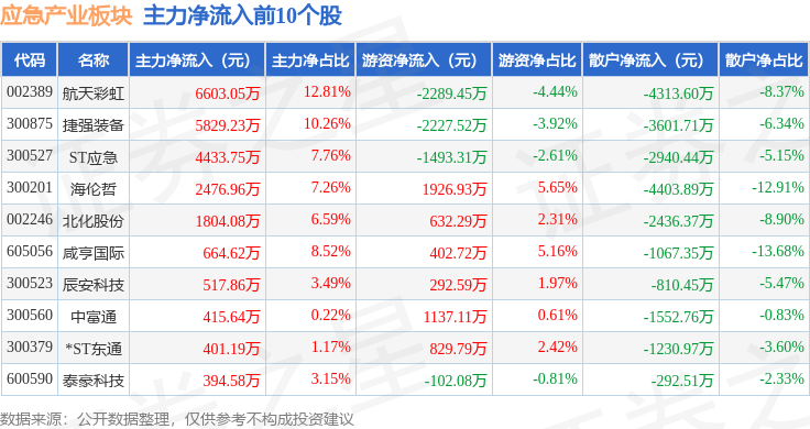 从资金流向上来看,当日应急产业板块主力资金净流出12.81亿元,游资资金净流入2.72亿元,散户资金净流入10.09亿元。应急产业板块个股资金流向见下表: