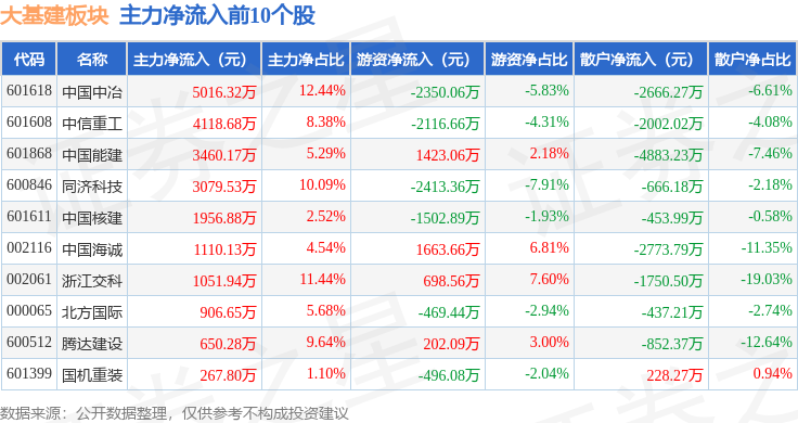 从资金流向上来看,当日大基建板块主力资金净流出11.02亿元,游资资金净流入1.86亿元,散户资金净流入9.17亿元。大基建板块个股资金流向见下表: