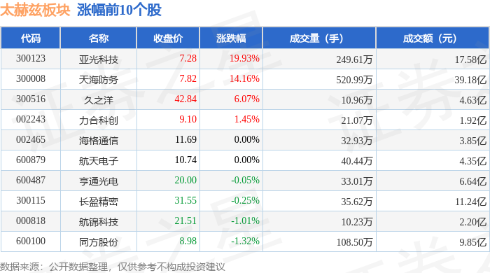 证券之星消息,11月19日太赫兹板块较上一交易日上涨0.32%,亚光科技领涨。当日上证指数报收于3946.74,上涨0.18%。深证成指报收于13080.09,下跌0.0%。太赫兹板块个股涨跌见下表: