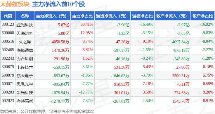 从资金流向上来看,当日太赫兹板块主力资金净流入8.02亿元,游资资金净流出3.76亿元,散户资金净流出4.25亿元。太赫兹板块个股资金流向见下表:
