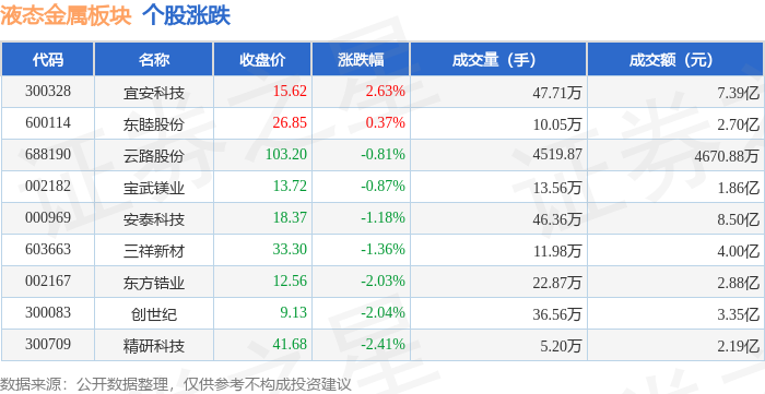 证券之星消息,11月19日液态金属板块较上一交易日下跌0.8%,精研科技领跌。当日上证指数报收于3946.74,上涨0.18%。深证成指报收于13080.09,下跌0.0%。液态金属板块个股涨跌见下表: