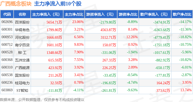 从资金流向上来看,当日广西概念板块主力资金净流出5.85亿元,游资资金净流入1.93亿元,散户资金净流入3.92亿元。广西概念板块个股资金流向见下表: