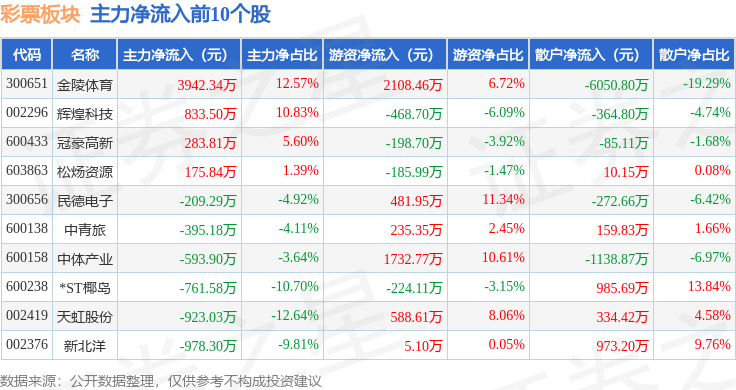 从资金流向上来看,当日彩票板块主力资金净流出2.89亿元,游资资金净流入9613.41万元,散户资金净流入1.93亿元。彩票板块个股资金流向见下表: