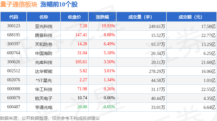 从资金流向上来看,当日量子通信板块主力资金净流出8.78亿元,游资资金净流入2.26亿元,散户资金净流入6.52亿元。量子通信板块个股资金流向见下表: