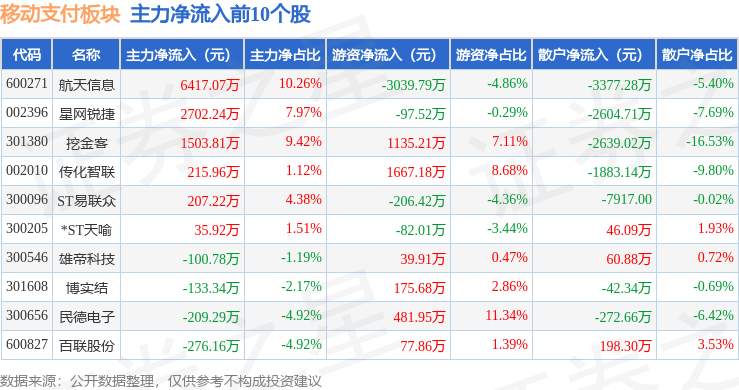 从资金流向上来看,当日移动支付板块主力资金净流出22.59亿元,游资资金净流入4.49亿元,散户资金净流入18.09亿元。移动支付板块个股资金流向见下表: