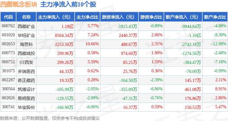 从资金流向上来看,当日西藏概念板块主力资金净流出8171.85万元,游资资金净流出1.12亿元,散户资金净流入1.93亿元。西藏概念板块个股资金流向见下表: