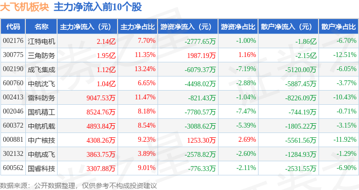 从资金流向上来看,当日大飞机板块主力资金净流出5.23亿元,游资资金净流入1.68亿元,散户资金净流入3.55亿元。大飞机板块个股资金流向见下表: