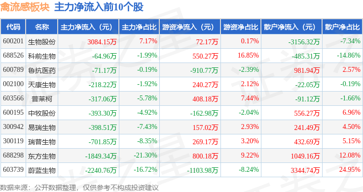 从资金流向上来看,当日禽流感板块主力资金净流出5829.98万元,游资资金净流入1975.27万元,散户资金净流入3854.71万元。禽流感板块个股资金流向见下表: