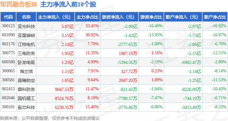 从资金流向上来看,当日军民融合板块主力资金净流出18.93亿元,游资资金净流出1.08亿元,散户资金净流入20.01亿元。军民融合板块个股资金流向见下表: