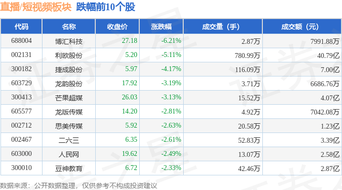 证券之星消息,11月19日直播/短视频板块较上一交易日下跌1.75%,博汇科技领跌。当日上证指数报收于3946.74,上涨0.18%。深证成指报收于13080.09,下跌0.0%。直播/短视频板块个股涨跌见下表: