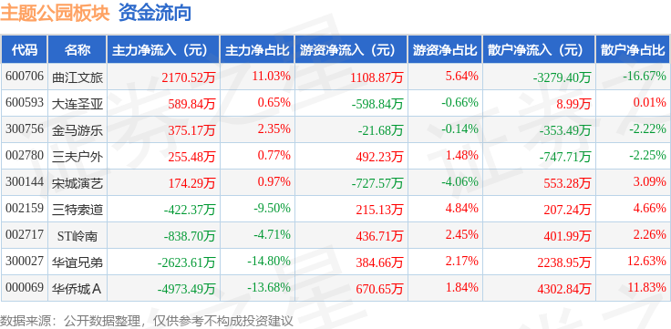 从资金流向上来看,当日主题公园板块主力资金净流出5292.86万元,游资资金净流入1960.16万元,散户资金净流入3332.7万元。主题公园板块个股资金流向见下表: