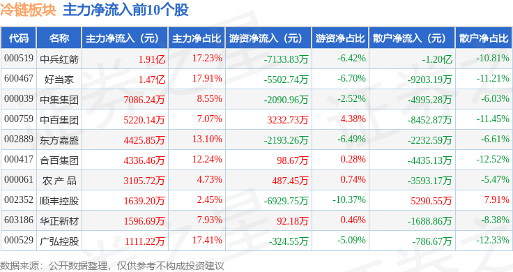 从资金流向上来看,当日冷链板块主力资金净流出23.4亿元,游资资金净流入1.89亿元,散户资金净流入21.51亿元。冷链板块个股资金流向见下表: