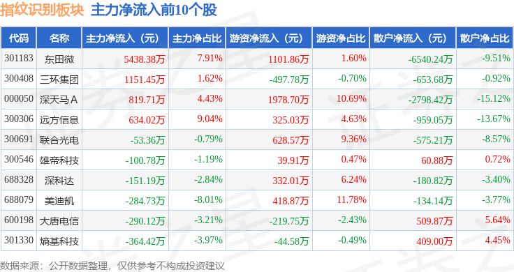 从资金流向上来看,当日指纹识别板块主力资金净流出9.84亿元,游资资金净流入1.23亿元,散户资金净流入8.61亿元。指纹识别板块个股资金流向见下表: