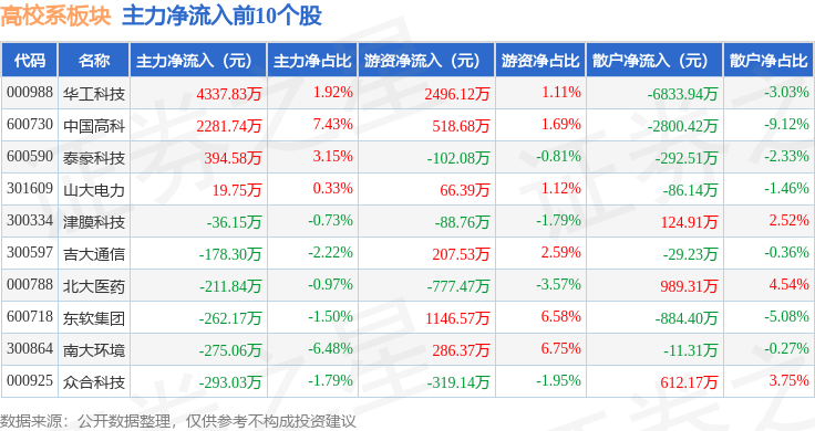 从资金流向上来看,当日高校系板块主力资金净流出5.6亿元,游资资金净流入9597.8万元,散户资金净流入4.64亿元。高校系板块个股资金流向见下表: