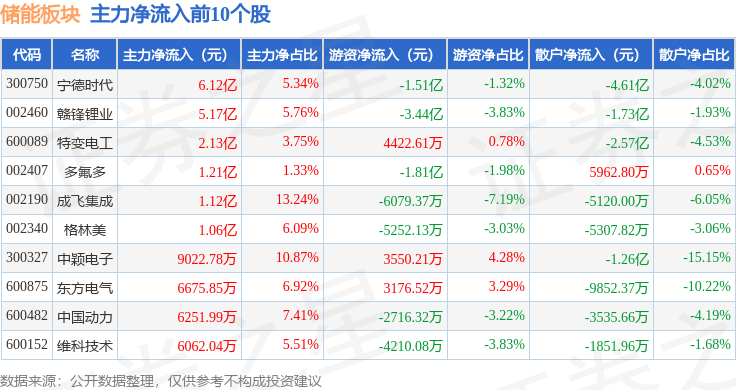 从资金流向上来看,当日储能板块主力资金净流出73.61亿元,游资资金净流入4.62亿元,散户资金净流入68.99亿元。储能板块个股资金流向见下表: