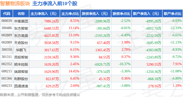 从资金流向上来看,当日智慧物流板块主力资金净流出11.52亿元,游资资金净流入2594.14万元,散户资金净流入11.26亿元。智慧物流板块个股资金流向见下表:
