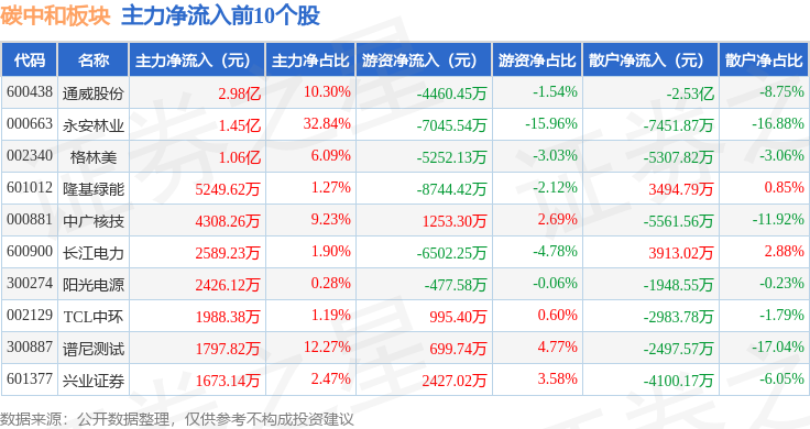 从资金流向上来看,当日碳中和板块主力资金净流出5.38亿元,游资资金净流出1.8亿元,散户资金净流入7.18亿元。碳中和板块个股资金流向见下表: