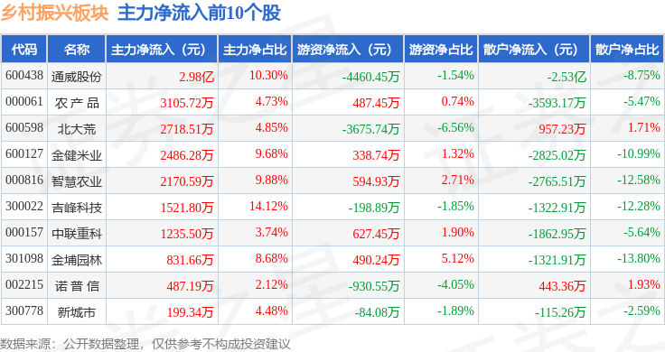 从资金流向上来看,当日乡村振兴板块主力资金净流出2.23亿元,游资资金净流入3587.05万元,散户资金净流入1.87亿元。乡村振兴板块个股资金流向见下表: