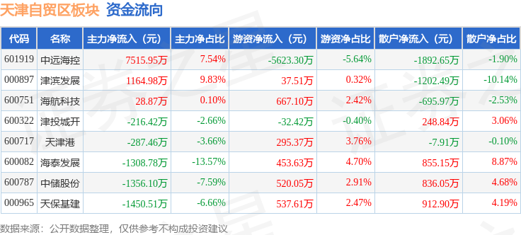 从资金流向上来看,当日天津自贸区板块主力资金净流入4090.53万元,游资资金净流出3144.46万元,散户资金净流出946.07万元。天津自贸区板块个股资金流向见下表:
