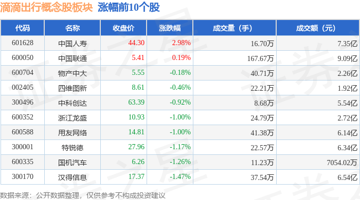 从资金流向上来看,当日滴滴出行概念股板块主力资金净流出5.61亿元,游资资金净流入2.26亿元,散户资金净流入3.35亿元。滴滴出行概念股板块个股资金流向见下表:
