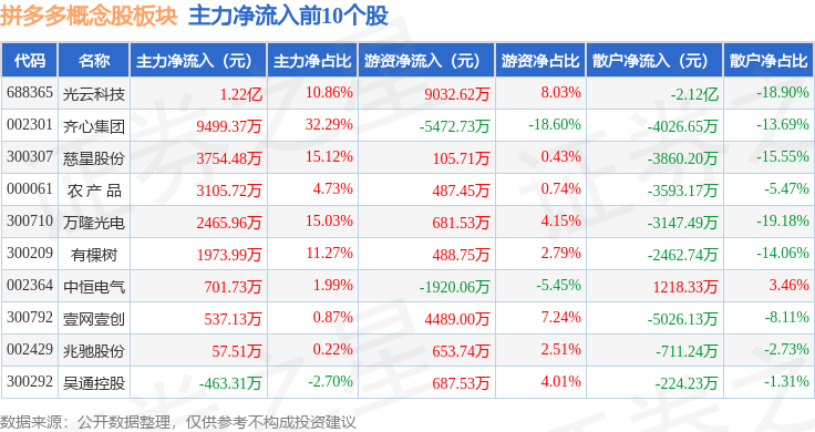 从资金流向上来看,当日拼多多概念股板块主力资金净流出3.98亿元,游资资金净流入2275.16万元,散户资金净流入3.75亿元。拼多多概念股板块个股资金流向见下表:
