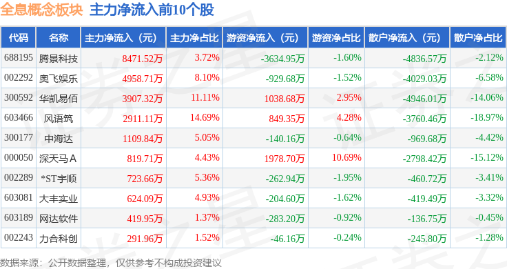从资金流向上来看,当日全息概念板块主力资金净流出6.65亿元,游资资金净流入1.95亿元,散户资金净流入4.7亿元。全息概念板块个股资金流向见下表: