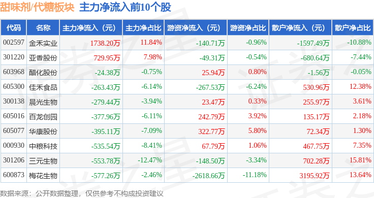 从资金流向上来看,当日甜味剂/代糖板块主力资金净流出3.0亿元,游资资金净流出1005.22万元,散户资金净流入3.1亿元。甜味剂/代糖板块个股资金流向见下表: