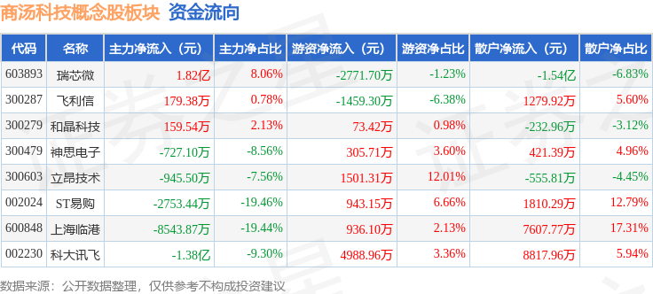 从资金流向上来看,当日商汤科技概念股板块主力资金净流出8237.75万元,游资资金净流入4517.64万元,散户资金净流入3720.11万元。商汤科技概念股板块个股资金流向见下表: