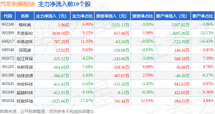 从资金流向上来看,当日汽车拆解板块主力资金净流出8485.3万元,游资资金净流入1332.86万元,散户资金净流入7152.45万元。汽车拆解板块个股资金流向见下表: