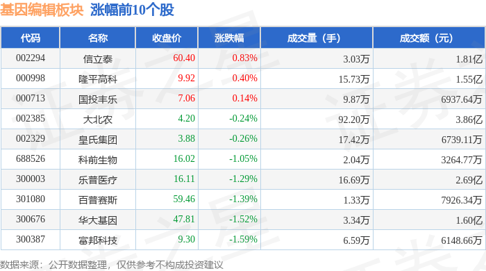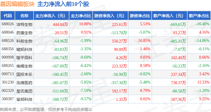 从资金流向上来看,当日基因编辑板块主力资金净流出5.14亿元,游资资金净流入7965.68万元,散户资金净流入4.34亿元。基因编辑板块个股资金流向见下表: