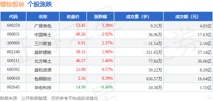 证券之星消息,11月19日镨钕板块较上一交易日上涨1.44%,广晟有色领涨。当日上证指数报收于3946.74,上涨0.18%。深证成指报收于13080.09,下跌0.0%。镨钕板块个股涨跌见下表:
