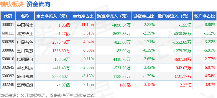 从资金流向上来看,当日镨钕板块主力资金净流出7865.44万元,游资资金净流出1702.07万元,散户资金净流入9567.5万元。镨钕板块个股资金流向见下表: