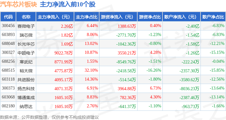 从资金流向上来看,当日汽车芯片板块主力资金净流出20.0亿元,游资资金净流入3.25亿元,散户资金净流入16.74亿元。汽车芯片板块个股资金流向见下表: