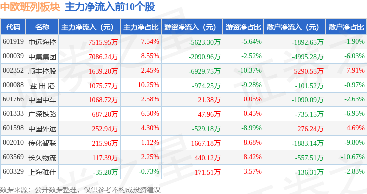 从资金流向上来看,当日中欧班列板块主力资金净流出1944.78万元,游资资金净流出6607.81万元,散户资金净流入8552.59万元。中欧班列板块个股资金流向见下表:
