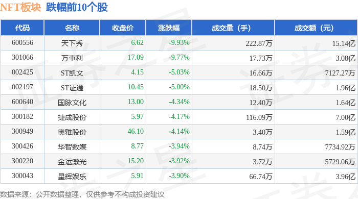 证券之星消息,11月19日NFT板块较上一交易日下跌0.52%,天下秀领跌。当日上证指数报收于3946.74,上涨0.18%。深证成指报收于13080.09,下跌0.0%。NFT板块个股涨跌见下表: