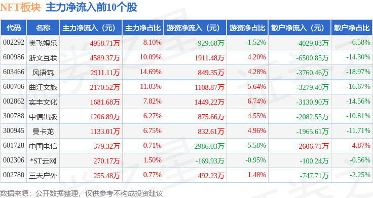 从资金流向上来看,当日NFT板块主力资金净流出25.41亿元,游资资金净流入5.63亿元,散户资金净流入19.78亿元。NFT板块个股资金流向见下表: