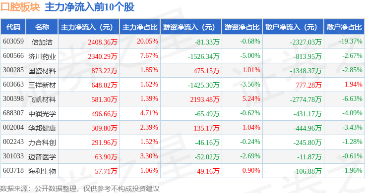 从资金流向上来看,当日口腔板块主力资金净流出4.91亿元,游资资金净流入8386.33万元,散户资金净流入4.07亿元。口腔板块个股资金流向见下表: