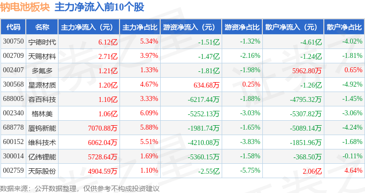 从资金流向上来看,当日钠电池板块主力资金净流出16.81亿元,游资资金净流出11.78亿元,散户资金净流入28.59亿元。钠电池板块个股资金流向见下表: