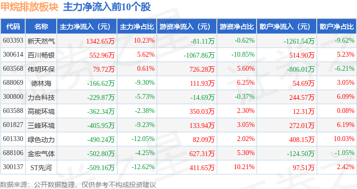 从资金流向上来看,当日甲烷排放板块主力资金净流出1.28亿元,游资资金净流入2963.63万元,散户资金净流入9818.48万元。甲烷排放板块个股资金流向见下表: