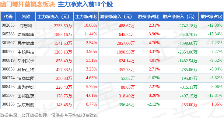从资金流向上来看,当日幽门螺杆菌概念板块主力资金净流出5.08亿元,游资资金净流出3982.65万元,散户资金净流入5.48亿元。幽门螺杆菌概念板块个股资金流向见下表: