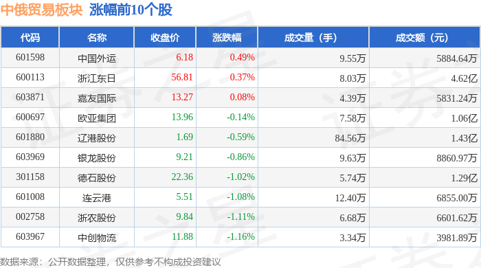 证券之星消息,11月19日中俄贸易板块较上一交易日下跌0.72%,浙江力诺领跌。当日上证指数报收于3946.74,上涨0.18%。深证成指报收于13080.09,下跌0.0%。中俄贸易板块个股涨跌见下表: