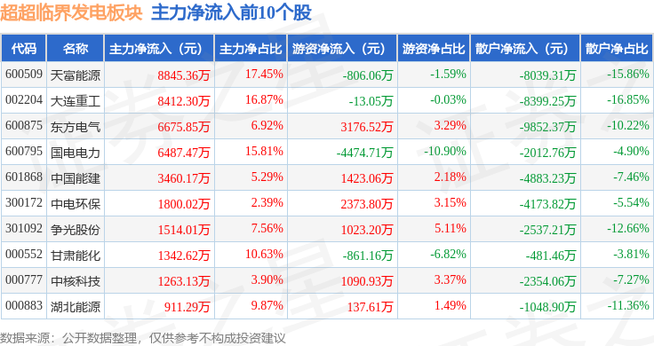 从资金流向上来看,当日超超临界发电板块主力资金净流出1.45亿元,游资资金净流出614.58万元,散户资金净流入1.51亿元。超超临界发电板块个股资金流向见下表: