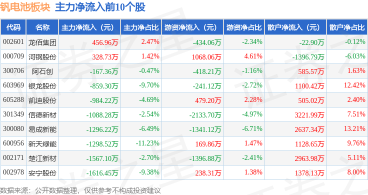 从资金流向上来看,当日钒电池板块主力资金净流出13.07亿元,游资资金净流出2383.3万元,散户资金净流入13.31亿元。钒电池板块个股资金流向见下表: