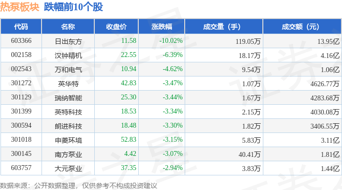证券之星消息,11月19日热泵板块较上一交易日下跌1.67%,日出东方领跌。当日上证指数报收于3946.74,上涨0.18%。深证成指报收于13080.09,下跌0.0%。热泵板块个股涨跌见下表: